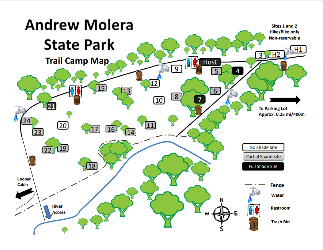 The Trail Camp features 22 tent-only sites and 2 hike-and-bike campsites for hikers or cyclists who are only passing through the area. There are no group or accessible sites. The campground and park close for the season on November 1.
