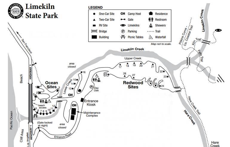 Limekiln State Park has 29 campsites scattered in two loops; the Ocean Loop and the Redwood Loop. The Ocean Loop has about 10 sites for RVs of up to 24 feet, while the Redwood Loop has sites inland for tents. Most campsites can accommodate a maximum of 2 vehicles and 8 people, but certain sites only allow for 1 vehicle.