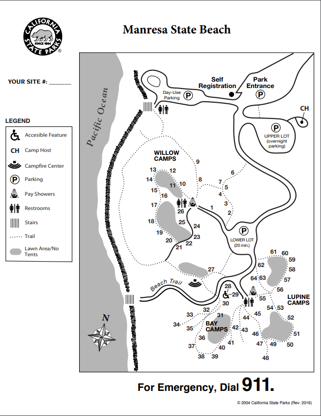 Manresa State Beach Campground has 64 walk-ins, tent-only sites located on a bluff overlooking the Pacific Ocean. The campground is divided into 3 sectors; Willow, Bay, and Lupine. Each site that can host a maximum of 8 people has a table, fire pit, and a food locker. There are pay showers so bring plenty of quarters.
