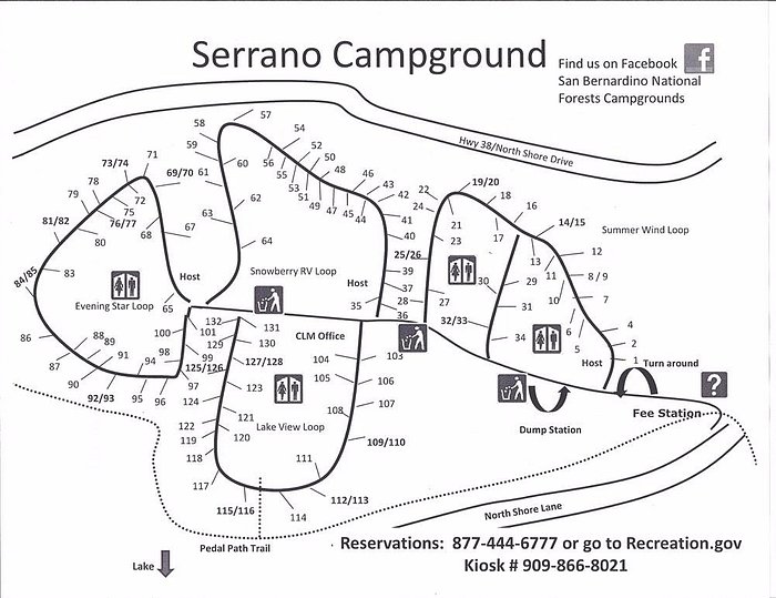 Serrano Campground is popular with families enjoying the lake and going hiking, biking, boating, swimming, fishing, and kayaking. There are hookups and a dump station, and pets are allowed throughout the property.